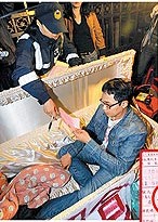中新網(wǎng)11月16日電 據(jù)臺灣《蘋果日報》報道,日前吃牛糞抗議美國牛肉進口的臺大社會學研究所博士班學生朱政騏,前晚開始在“立法院”大門口前躺棺絕食抗議美牛進口,被警方以違反“未依規(guī)定在道路堆放雜物,妨礙通行”為由開罰。