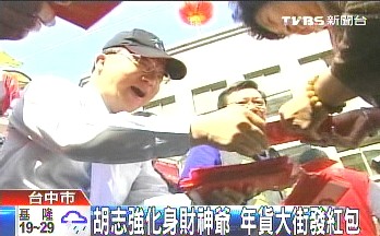 再過幾天就是農(nóng)歷春節(jié),臺中天津路年貨大街為了增加人氣,請胡志強(qiáng)發(fā)紅包,民眾大排長龍,不少小朋友領(lǐng)到市長紅包,嘴巴也變甜了,“祝市長新年快樂,年年有余,大吉大利!”還有一位阿伯為了見到胡志強(qiáng),連續(xù)3年都來領(lǐng)紅包。