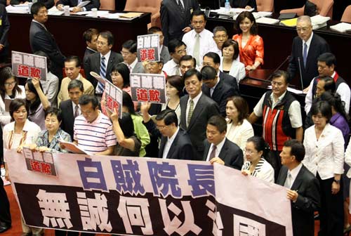 據(jù)臺(tái)灣媒體報(bào)道,吳敦義上午就來到“立法院”準(zhǔn)備報(bào)告施政方針,但還沒上臺(tái),事前保密到家的民進(jìn)黨“立委”們,突然拿著白布條、標(biāo)語霸占主席臺(tái),大喊“白賊義,道歉”,稱吳敦義香港行的說法一變?cè)僮儯姓\信問題。吳敦義則留在原位,國民黨人上前安撫,也做護(hù)駕動(dòng)作,避免與民進(jìn)黨“立委”發(fā)生肢體沖突。