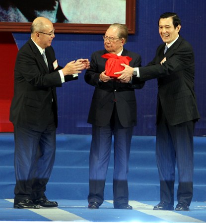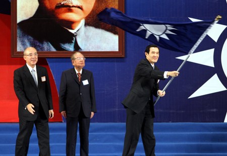 在主席監(jiān)誓人、國民黨選監(jiān)委員會召集人邱創(chuàng)煥的監(jiān)交下,馬英九從卸任黨主席吳伯雄手中接下印信、黨旗,宣告“馬主席時(shí)代”來臨,國民黨將邁向以黨輔政的“完全執(zhí)政、完全負(fù)責(zé)”新局。