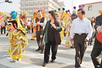 陳菊昨天上午參加高雄縣議員史萬(wàn)忠的告別式,并接受湖內(nèi)鄉(xiāng)民邀請(qǐng),在迎回湖內(nèi)鄉(xiāng)葉厝村清水寺供奉的辛府元帥時(shí),在湖內(nèi)鄉(xiāng)太爺村、葉厝村交界,帶電音三太子,一起加入迎神遶境活動(dòng),并向往來(lái)的民眾揮手致意。