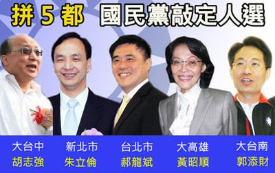 中新網(wǎng)5月11日電 綜合臺灣媒體報道,國民黨中央提名審核委員會11日決定“五都”征召人選,國民黨秘書長金溥聰宣布臺北市、新北市、大臺中、大臺南、大高雄分別征召臺北市長郝龍斌、“行政院副院長”朱立倫、臺中市長胡志強(qiáng)、前“立委”郭添財、“立委”黃昭順代表國民黨參選。