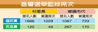 中新網(wǎng)6月13日電 據(jù)臺(tái)灣《聯(lián)合報(bào)》報(bào)道,臺(tái)灣17縣市基層選舉結(jié)果12日晚揭曉,國(guó)民黨(含以無(wú)黨籍參選的黨員)拿下1988席村里長(zhǎng)、1187席鄉(xiāng)鎮(zhèn)市民代表,各約占總席次半數(shù),輔選系統(tǒng)評(píng)估,藍(lán)軍總當(dāng)選席次明顯高于綠營(yíng),藍(lán)綠基層版圖變動(dòng)不大。