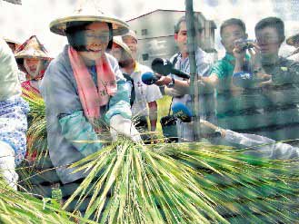 從未割過稻的蔡英文,跟著農(nóng)民左手抓起一把稻穗,接著右手以鐮刀割下,一開始動作有些生疏,第二次即有模有樣,她興奮地將自己的收成高高舉起,成為鏡頭獵取對象。