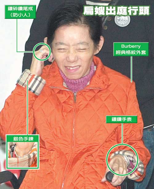 吳淑珍上次出庭時(shí)穿著七萬多元的Dior雪衣,配戴大顆翡翠尾戒,且面對鏡頭時(shí)態(tài)度相當(dāng)不悅,不時(shí)露出不耐煩的表情。昨天出庭時(shí),吳淑珍改穿Burberry價(jià)格約三萬元鋪棉外套,改戴另一只鑲碎鉆尾戒,鉆石較小、較為秀氣,吳淑珍的態(tài)度也變得和善許多。