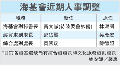 去年底,;鶗耸碌卣,包括綜合處、經(jīng)貿(mào)處、文化處在內(nèi)等“一正處長、二副處長”都未獲續(xù)任。近期被視為是;鶗詈笠晃磺俺笋R的林淑閔,日前離職,遺缺由高文誠遞補(bǔ),這項(xiàng)新人事也待“陸委會”核備。