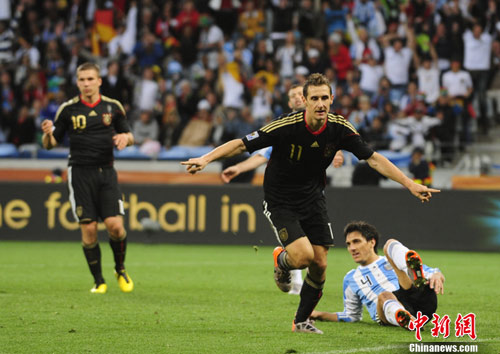 法新社報(bào)道的標(biāo)題為,“德國擊潰阿根廷殺入世界杯半決賽”。報(bào)道稱,克洛澤用兩個(gè)進(jìn)球慶祝他的第100場國家隊(duì)進(jìn)球,他幫助德國4比0狂勝阿根廷。