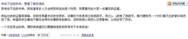 “X來(lái)自未來(lái)”的ID注冊(cè)于6月13日。該網(wǎng)友還表示,“希望我的這番話不要在世界杯決賽前傳到南非,否則我擔(dān)心球員心態(tài)受影響,從而改變了歷史。一個(gè)月后我會(huì)回來(lái),那時(shí)候希望你們?cè)敢庀嘈盼业乃嘘P(guān)于未來(lái)的話!”