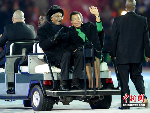 本網(wǎng)記者在約堡足球城球場目擊看到,納爾遜·曼德拉夫婦乘坐一輛電瓶車在球場中央亮相,繞了一小圈揮手向現(xiàn)場觀眾致意后,微笑著離開了球場。在離開球場之前,國際足聯(lián)主席布拉特特地走到電瓶車前,向曼德拉夫婦致意感謝。曼德拉夫婦亮相足球城球場的時(shí)間大約為3分鐘。