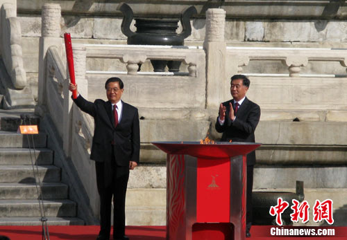 隨后,廣東省委書記汪洋從火種衛(wèi)士手中接過引火棒,點(diǎn)燃祈年殿前的火種盆。中共中央總書記、國家主席胡錦濤在火種盆中點(diǎn)燃了火炬,亞運(yùn)北京首棒火炬手張琳從胡錦濤手中接過了火炬“潮流”。