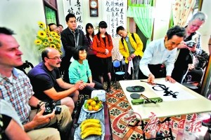 下午2時(shí)整,羅澤權(quán)下樓迎接德國游客。一名德國游客連連稱贊說,“能夠把古建筑保留下來,對(duì)于這個(gè)地區(qū)非常有意義,都府社區(qū)古色古香,反映了廣州的歷史文化,非常棒!”過了一會(huì)兒,羅澤權(quán)老人拿出筆墨紙硯,揮毫寫下了一個(gè)大大的“福”字,并將這幅書法送給了其中一名德國游客。臨別時(shí),23名德國游客依依不舍地與羅澤權(quán)老人一一握手道別,并祝他老人家“健康長壽,越活越年輕”!