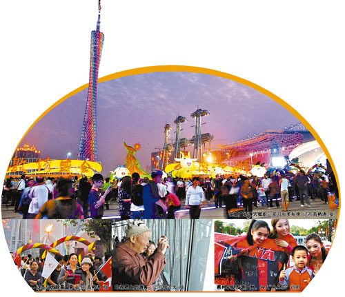 昨日的花城廣場,就像過大年一樣熱鬧,里里外外都是游客,一家大小三代人,每一個人臉上都洋溢著幸福和快樂,大家紛紛與亞運圣火合照,與廣州塔合影,把亞運時刻定格在鏡頭之中。
