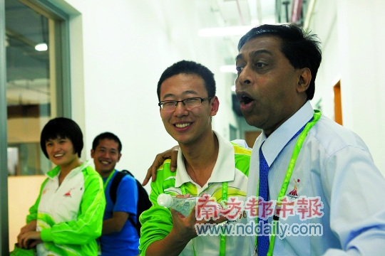 結(jié)果本該短短兩分鐘的路程,我們竟然走了大半天。因為哈利姆一出門看見一位中國志愿者小伙子臉上沒笑容,就摟著他說:“嘿,你干嘛不笑一笑,你看上去比我還老!比缓笏蛽е@個志愿者問記者:“我年輕還是他年輕?”記者識趣地回答:“當(dāng)然是您!彼_心地哈哈大笑。原以為就到此結(jié)束了,忽然走來一位頭發(fā)已花白的馬來西亞隊官員,哈利姆立刻放開志愿者小伙子,摟住這位老人家,然后又問一遍記者:“我年輕還是他年輕?”