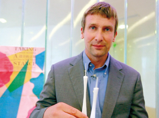 11月14日晚,廣州新電視塔頂層,在這個尚未開放的區(qū)域,這座“小蠻腰”的設計師馬克(MARK HEMEL,見上圖)接受了羊城晚報記者專訪。馬克的記憶,還停留在亞運開幕式那晚電視塔璀璨奪目的那刻,他既驚嘆又感慨,連連稱:“‘女兒’終于出閣了!”