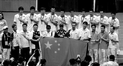 艱難戰(zhàn)勝韓國隊(duì),賽后李永波帶領(lǐng)男隊(duì)打出特有的慶祝手勢(shì)。周民 攝