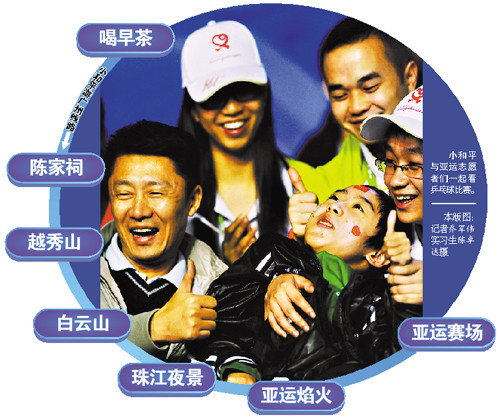 喝早茶、逛陳家祠、在五羊雕塑下照全家!驮趤嗊\(yùn)開幕當(dāng)天,由本報(bào)發(fā)起的“圓夢(mèng)愛心團(tuán)”帶著來(lái)自四川的絕癥少年小和平游廣州、嘗美食。昨天早上,在愛心團(tuán)的陪護(hù)下,小和平又來(lái)到離醫(yī)院最近的廣州體育館,觀看中國(guó)隊(duì)與伊朗隊(duì)的乒乓球男雙比賽,這是他第一次現(xiàn)場(chǎng)看球賽。