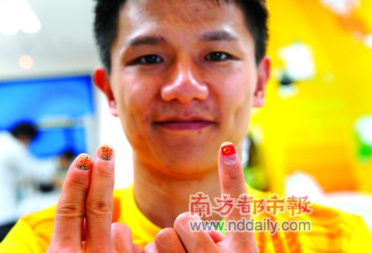 昨晚的體操吊環(huán)男子決賽,陳一冰以一套完美的動(dòng)作,登上亞運(yùn)冠軍的領(lǐng)獎(jiǎng)臺(tái)。奪冠后他展示了自己的指甲,上面涂了兩個(gè)紅色的字———“冰”和“娜”,加上“N o.1”,意思是希望自己和女友何雯娜都拿第一。