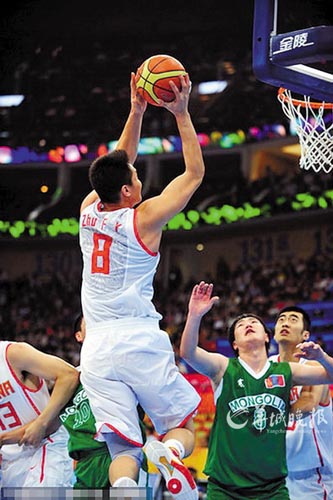 蒙古“巴特爾”雖然普遍身材矮小,但“下盤(pán)”穩(wěn)、靈活、有一定的遠(yuǎn)投功夫。然而,籃球畢竟是“長(zhǎng)人”的運(yùn)動(dòng),在高舉高打的中國(guó)隊(duì)面前,蒙古隊(duì)除了偶爾在外線發(fā)發(fā)炮外,顯得一籌莫展,打了4分多鐘才得到2 分,上半場(chǎng)中國(guó)隊(duì)已經(jīng)以48比21領(lǐng)先了27分。一面倒的比賽令全場(chǎng)1.7萬(wàn)觀眾有些索然無(wú)味,下半場(chǎng)一段時(shí)間蒙古隊(duì)連續(xù)打進(jìn)5分,觀眾竟喝彩聲雷動(dòng)。