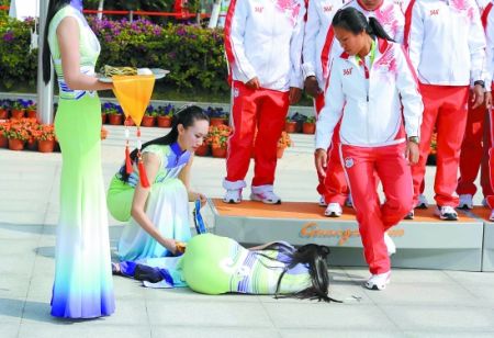 龍舟這一本屆亞運(yùn)會(huì)新增項(xiàng)目昨天首秀,所有人都充滿了好奇。無數(shù)記者涌向龍舟比賽場(chǎng),見證這歷史性的時(shí)刻。不過誰(shuí)也沒有想到,一次在場(chǎng)外發(fā)生的小小意外,卻吸引了所有人的關(guān)注——龍舟比賽頒獎(jiǎng)儀式,一名手捧銀牌的禮儀小姐突然暈倒在地,手中的銀牌悉數(shù)落在地上。