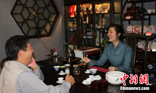 來自廣州茶文化促進會的資深評茶師張沙小姐,穿著一襲中國傳統(tǒng)的扣襟唐裝、腕戴玉石手鐲,一副古質(zhì)美女氣質(zhì)。她泡茶姿勢一招一式都見功夫,而談起茶來更是滔滔不絕。泡了一壺新茶鐵觀音,她告訴客人們:“第一泡,味同嬰兒般柔滑”、“第二泡,味如青年般活力”、“第三泡,味如成熟少婦的韻味”……說至此,圍坐一起的茶客不禁笑將起來。