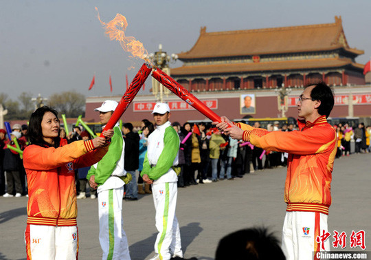 10時(shí)21分,中共中央政治局委員、廣東省委書記汪洋用在北京中華世紀(jì)壇采集的圣火火種,點(diǎn)燃了火種盆。習(xí)近平神情莊重,從火種盤點(diǎn)燃火炬,然后高高舉起火炬,向人們展示。
