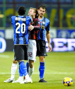 比賽的另一個焦點就是處于轉(zhuǎn)會漩渦中的貝克漢姆。留守米蘭受阻明顯影響到了貝帥的心情,開賽沒多久小貝就和國米的蒙塔里發(fā)生了小摩擦,倒霉的小貝還被對手掐了脖子,不過主裁判并沒有任何表示。更倒霉的是第57分鐘,小貝因為右大腿肌肉拉傷而不得不提前下場。
