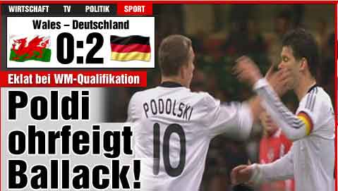 中新網(wǎng)4月2日電 在今天凌晨進(jìn)行的一場(chǎng)世界杯歐洲區(qū)預(yù)選賽中,德國(guó)隊(duì)客場(chǎng)2-0輕取威爾士。不過在比賽中,隊(duì)長(zhǎng)巴拉克和前鋒波多爾斯基發(fā)生沖突,被隊(duì)友在體育場(chǎng)眾目睽睽之下扇了一記耳光。