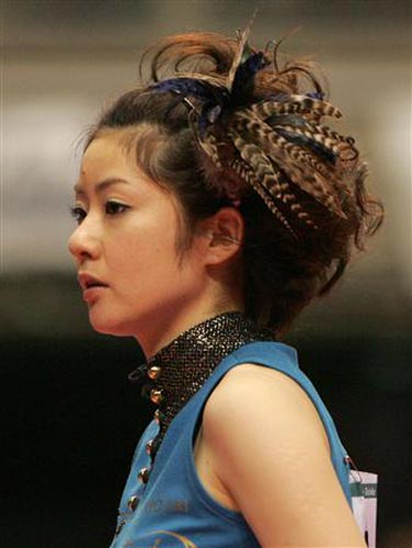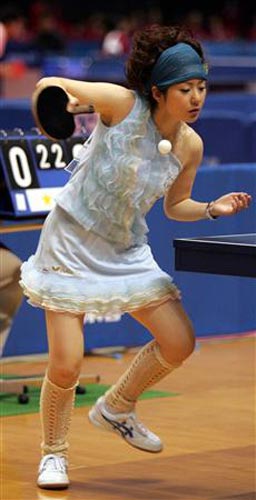 在日本乒壇,福原愛(ài)名聲最大,其次就是有著漂亮臉蛋、性感身材的四元奈生美了。今年30歲的四元在日本的影響并不比福原愛(ài)低多少。從2007年的全日本乒乓球錦標(biāo)賽至今,這位美女球員每次比賽都會(huì)換上不同的時(shí)尚超短裙,或是露出香肩的吊帶衫參賽。而且,她的頭飾也都是經(jīng)過(guò)發(fā)型師精心設(shè)計(jì)的,爆炸式、淑女式……總之,五顏六色的服裝+各類怪異的發(fā)型+比賽場(chǎng)上揮拍動(dòng)作都是那么的迷人,相比于其他運(yùn)動(dòng)員的一臉嚴(yán)肅,四元奈生美在賽場(chǎng)上刮起的時(shí)尚之風(fēng)迷倒了很多日本男球迷。