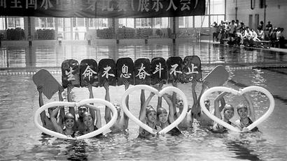 在“你說(shuō)你的美麗已經(jīng)不再,地動(dòng)山搖將你變得蒼白”的朗誦聲中,阿壩師專拉拉操隊(duì)員開始了他們的自選動(dòng)作表演——一套反映從地震發(fā)生時(shí)的無(wú)助到重建家園信心十足的水中健身操。