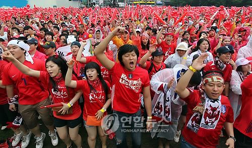 在韓國國內(nèi),熱情的韓國球迷也早早走上街頭,準(zhǔn)備為太極虎助威。警方稱,全國街頭助威地點共有280多處,預(yù)計會有178.6550萬名球迷為遠(yuǎn)征南非的太極虎助威。在首爾市,規(guī)模最大的助威場地要數(shù)首爾廣場,預(yù)計會云集25萬名球迷。盡管今天該國普降大雨,廣場卻已站滿了人,甚至有熱心球迷早上7點就來占位。