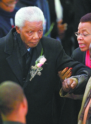 澤娜妮是在世界杯開幕前夜不幸遇難的,91歲高齡的曼德拉也因此取消了出席開幕式的計(jì)劃。上午8時(shí),悼念儀式在學(xué)校禮堂舉行。熱愛(ài)音樂(lè)的澤娜妮生前是該校唱詩(shī)班和樂(lè)隊(duì)的成員,幾乎每個(gè)人都喜歡這位性格開朗、活潑的小女孩。儀式以一首悼念歌曲開始,緊接著播放了一組幻燈片,由澤娜妮與曼德拉開心擁抱的合影組成。隨后,幾位親屬代表上前致悼詞。老曼德拉也在親人的陪伴下,步履蹣跚地來(lái)到儀式現(xiàn)場(chǎng),他的衣襟上別著一小簇粉紅色的花束,始終坐在前排,神情十分哀傷。
