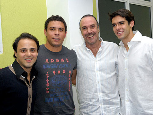 6 月10日是卡卡的兒子盧卡滿一周歲的日子,而當(dāng)天小盧卡的父親卻正跟隨巴西隊(duì)迎戰(zhàn)巴拉圭隊(duì)。為了彌補(bǔ)這個(gè)遺憾,上周日,卡卡特意在巴西圣保羅為兒子補(bǔ)辦了一個(gè)生日宴會(huì),邀請(qǐng)了埃拉諾、羅比尼奧、F1車手馬薩和羅納爾多等100多名嘉賓參加。光臨現(xiàn)場(chǎng)的其他嘉賓都是盛裝出席,沒(méi)想到羅納爾多卻穿著一件夠“潮 ”的體恤“閃亮”出場(chǎng)!衣服正面橫著幾個(gè)中文大字:“香港面粉廠”,旁邊像對(duì)聯(lián)一樣地印著“上等中糧白粉、特殊工藝……”等字樣,搞笑之極。在那排“香港面粉廠”的文字下面還有三個(gè)中文“單車嘜”,肥羅在搞笑之余還不忘體育鍛煉。