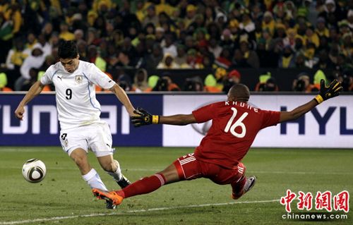 比賽開始后,場(chǎng)面進(jìn)行的比較平淡。第6分鐘烏拉圭獲得前場(chǎng)任意球機(jī)會(huì),弗蘭主罰的皮球被皮納爾提前從人墻中沖出用手擋出,被主裁判出示黃牌。隨后,蘇亞雷斯和弗蘭在南非隊(duì)前場(chǎng)打出配合,蘇亞雷斯的射門偏出。隨后弗西萊也有一腳射門偏出。