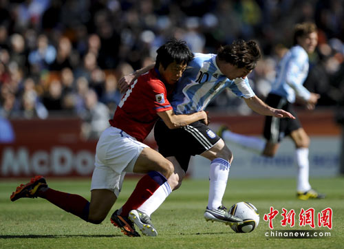 中新網(wǎng)6月17日電 北京時(shí)間今晚19點(diǎn)30分,2010年南非世界杯B組第二輪的首場比賽打響,由兩屆世界杯冠軍得主阿根廷隊(duì)迎戰(zhàn)亞洲“太極虎”韓國隊(duì)。16分鐘韓國隊(duì)前鋒樸周永不慎打入本屆世界杯的第二記烏龍;33分鐘阿根廷再獲得定位球,伊瓜因門前頭槌建功,2-0;上半場補(bǔ)時(shí)階段韓國隊(duì)由李青龍扳回1球,但下半場伊瓜因連入2球,上演本屆世界杯的第一個(gè)帽子戲法,助阿根廷4-1鎖定勝局,提前小組出線。