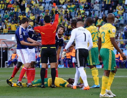 也許失球只是法國(guó)隊(duì)噩夢(mèng)的開(kāi)始,比賽進(jìn)行到第25分鐘,法國(guó)隊(duì)攻入南非隊(duì)禁區(qū),中場(chǎng)球員、有著“齊達(dá)內(nèi)接班人”之稱(chēng)的古爾庫(kù)夫在爭(zhēng)頂頭球時(shí)肘部擊中了對(duì)手,南非隊(duì)隊(duì)員就勢(shì)倒地不起做昏厥狀。主裁判果斷出示紅牌,將古爾庫(kù)夫罰下。
