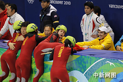 在裁判宣布韓國隊(duì)犯規(guī)后,一直等候著最終結(jié)果的中國姑娘忘情地?fù)湎蚪叹毾D片清楚地顯示,興奮的王濛撲到教練李琰前面寬寬的防護(hù)墊上,她的右腿無意間高高抬起,冰刀刮到了跟在她身后的張會的下巴。王濛意識到自己闖了禍,馬上關(guān)切地回頭察看張會的傷情。四位姑娘舉著國旗慶祝勝利時,張會用手捂著她的下巴,漸漸地鮮血浸濕了她的手套。