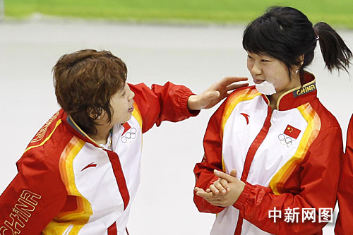 領(lǐng)獎臺上,王濛不時與張會說話,并用手指比劃著什么。中國隊(duì)領(lǐng)隊(duì)楊占武透露,張會受的只是皮外傷,沒有大的問題。