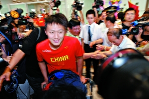 張琳推著行李車,走在運(yùn)動(dòng)員隊(duì)伍的最前面,他接連接過兩束鮮花。攝影記者將他團(tuán)團(tuán)圍住,閃光燈閃爍個(gè)不停。昨天中午,中國(guó)游泳隊(duì)載譽(yù)返京,在首都機(jī)場(chǎng)張琳成為最受關(guān)注的明星。接受采訪的間隙,還忙著給粉絲簽名。