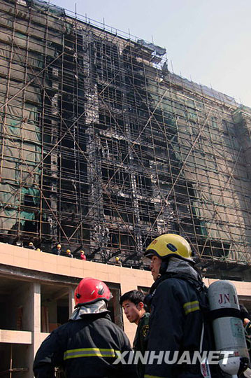 昨日上午9時許,記者趕到事故現(xiàn)場。3輛消防車在起火樓房外一字排開,幾名消防人員剛從樓內(nèi)撤離出來,正在收拾滅火工具;鹨驯粨錅,警方正在現(xiàn)場調(diào)查情況。著火的7號樓是一座10層高的在建樓房,該樓南側(cè)的施工防護網(wǎng)中部有很大一部分被燒焦,幾名工人正在三樓和樓頂對燒毀的防護網(wǎng)進行修復。