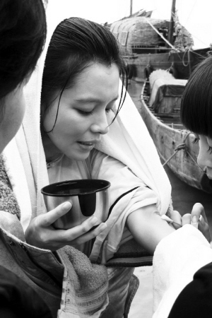 徐若瑄介紹,她扮演的黃蘇英是個(gè)美麗善良,而又堅(jiān)韌不拔的漁家女,看到孩子的同學(xué)不慎掉入水中,她當(dāng)即跳海救人。拍攝當(dāng)天,海邊的天氣十分寒冷,天空下著雨,海風(fēng)很大,導(dǎo)演為她的身體狀況擔(dān)心不已!拔視(huì)游泳,但因?yàn)橐托⊙輪T配合,所以要在海水中一遍遍試戲,很耗體力,后來(lái)我的腿都在抽筋了!北M管劇組提前準(zhǔn)備了充足的保暖和安全措施,上岸后的徐若王宣仍?xún)龅蒙l(fā)抖,幾盡虛脫狀態(tài),長(zhǎng)時(shí)間無(wú)法緩解過(guò)來(lái)!瘘S笑宇