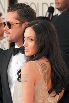 銀色情侶檔布拉德·皮特與安吉莉娜·茱莉雙雙入圍金球獎,俊男美女搶盡鋒頭。茱莉穿Atelier Versace禮服、露出修長玉腿和戴墨鏡的皮特十指緊扣踏上星光大道,但兩人都以微笑代替說話,連媒體想訪問皮特,都被茱莉巧妙帶開。