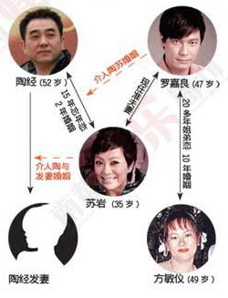 蘇巖和羅嘉良的結(jié)婚,用那個(gè)落后保守的詞來說,是兩個(gè)第三者的婚姻。蘇巖曾是中國電影第一錄音師陶經(jīng)的妻子,愛情源頭還是張藝謀的《活著》。蘇巖甘當(dāng)陶經(jīng)婚姻第三者,歷經(jīng)十多年終于結(jié)婚,而羅嘉良這次又介入了蘇巖的上一次婚姻。一直有猜測說蘇巖是導(dǎo)致羅嘉良與發(fā)妻離婚的第三者,其實(shí)不是,反倒是羅嘉良讓蘇巖下決心離婚的,F(xiàn)在兩人還在北京買了豪宅,羅嘉良正式落戶內(nèi)地了。