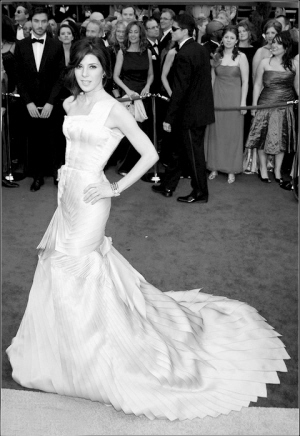 沉寂多年的托梅因影片《摔跤手》獲得提名。她以一襲華麗的范思哲白色單肩拖地長(zhǎng)裙亮相頒獎(jiǎng)典禮,并佩戴復(fù)古珠寶!短┪钍繄(bào)》稱(chēng)贊這套禮服的單肩設(shè)計(jì)展現(xiàn)了托梅完美的肩部和手臂線條,大量的“手風(fēng)琴褶”復(fù)雜、有趣,展現(xiàn)了主人的玲瓏曲線!度宋铩分芸卜Q(chēng)贊托梅在禮服的襯托下氣質(zhì)優(yōu)雅不凡。