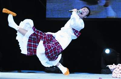經(jīng)過近2小時(shí)的“溫場(chǎng)”后,小沈陽(yáng)終于壓軸登臺(tái)亮相。一看到身穿標(biāo)志性的紅格子“蘇格蘭”服,背著小挎包的小沈陽(yáng)從后臺(tái)走出來時(shí),觀眾紛紛尖叫著起立。久候在舞臺(tái)邊的一群女粉絲手捧鮮花,欲沖過保安防線上前獻(xiàn)給偶像!皩(duì)我的粉絲要客氣哦!”小沈陽(yáng)金口一開,粉絲們立即突破了防線沖上臺(tái)去,有女粉絲獻(xiàn)過花后再來一個(gè)熊抱,后面的女粉絲更是“搶吻”小沈陽(yáng),“陽(yáng)仔(小沈陽(yáng)小名)我愛你”的真情表白更在劇場(chǎng)內(nèi)此起彼伏,看來小沈陽(yáng)的“女人緣”極好。