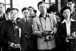 記者會開始時,“毛主席”和“蔣介石”分別從兩側(cè)走下樓梯,并在樓梯的交匯處握手留影。此時,孫紅雷第一個提問:“我是《中央日報》的記者,我注意到蔣主席和毛先生今天都穿了中山裝,請問在這樣一個特別的日子里穿一樣的著裝是否有什么特別的意義?”