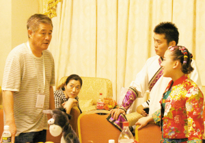 很少能看到趙本山和小沈陽同臺表演,這次海南之行的首場演出,恐怕也是“劉老根大舞臺笑轉(zhuǎn)2009”全國巡演中唯一一場本山師徒同臺的表演,因為觀眾是參加博鰲論壇的國際政要和經(jīng)濟(jì)專家。在演出后臺,本山首先演練了一遍即將在舞臺上表演的“吹拉彈唱”,隨后就開始對自己的徒弟一一評點。別看徒弟們個個在舞臺上精神抖擻,但在面對如此大場面時不免有些緊張,紛紛對師父說出自己的顧慮!皠e緊張,就當(dāng)是在咱們沈陽中街基地演了!”“你這個口我看可以使,沒關(guān)系,出了事我兜著!薄澳阒虚g的那一段就不要加了,不好,不文雅。”面對徒弟,本山嚴(yán)肅認(rèn)真地對他們的表演提出要求。因為對徒弟的表演和絕活爛熟于心,本山三言兩語就指出了他們的不足,并且提出了建議。有了他的點撥,徒弟們個個信心十足地走上了舞臺……