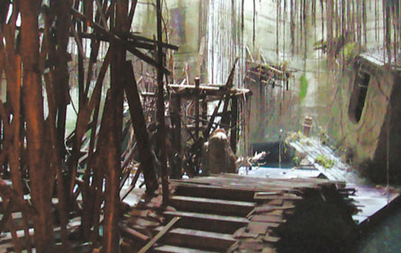 洞內(nèi)燈火通明,卻很陰冷潮濕,時(shí)不時(shí)聽(tīng)到滴滴答答的水聲,十幾個(gè)工人正在忙碌著趕制道具。一位工人師傅告訴記者,“我們已經(jīng)在這里忙活兩個(gè)月了,洞內(nèi)的所有木頭橋、破房子、還有垂掛下來(lái)的藤條等等,全是人工打造的!