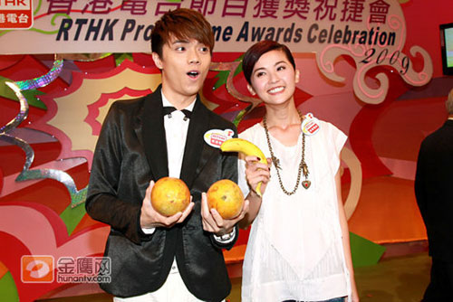 蔡卓妍(阿Sa)、張敬軒6日為港臺(tái)獲獎(jiǎng)祝捷會(huì)擔(dān)任頒獎(jiǎng)嘉賓,會(huì)上公布0八至0九年度獲得的七十七個(gè)國(guó)際及本地電視獎(jiǎng)項(xiàng);顒(dòng)后,阿Sa與軒仔影合照,軒仔拿著兩個(gè)大木瓜遞給阿Sa,并笑說:“以形補(bǔ)形。”