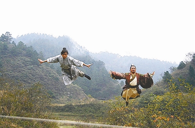 在“丐幫聚會大廳”的一場戲中,張無忌獨闖丐幫,一人力敵丐幫數(shù)名高手。這場戲要求鄧超完成一整套武打動作并要一氣呵成將圍在他身邊的高手們打翻在地。為了拍好這場戲,鄧超向劇組中的武行師傅們討教了不少武打秘訣。
