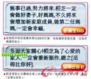 據(jù)報(bào)道,香港某周刊日前爆出張柏芝再度懷孕的消息。據(jù)悉,張柏芝弟弟張豪龍向該周刊轉(zhuǎn)發(fā)了姐弟間的短信,該周刊根據(jù)短信內(nèi)容證實(shí)張柏芝已再度懷孕。另外謝霆鋒媽媽狄波拉接受訪(fǎng)問(wèn)時(shí)也稱(chēng),兒媳已經(jīng)開(kāi)始吃補(bǔ)品再為謝家添丁。